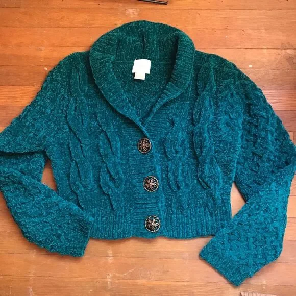 TEAL VELOUR 80’s Cardigan Sweater Size M/L.Stylish and SEXY, this TRUE TEAL, chunky velour cardigan is adorned with silver “snowflake” metal buttons, curve-hugging knit, roll collar and cropped design. Irish braided.Perfect with jeans, leggings and skirts. Sexy, warm & jewel toned. Marked JUDY & a size SMALL.MEASUREMENTS-Bust- 38 relaxed, 44 stretched.Waist- 32 relaxed, 38 stretched.Shoulders- 17 inches.Sleeve Length- 25 inches.Sweater Length- 19 inches.EXCELLENT CONDITION.