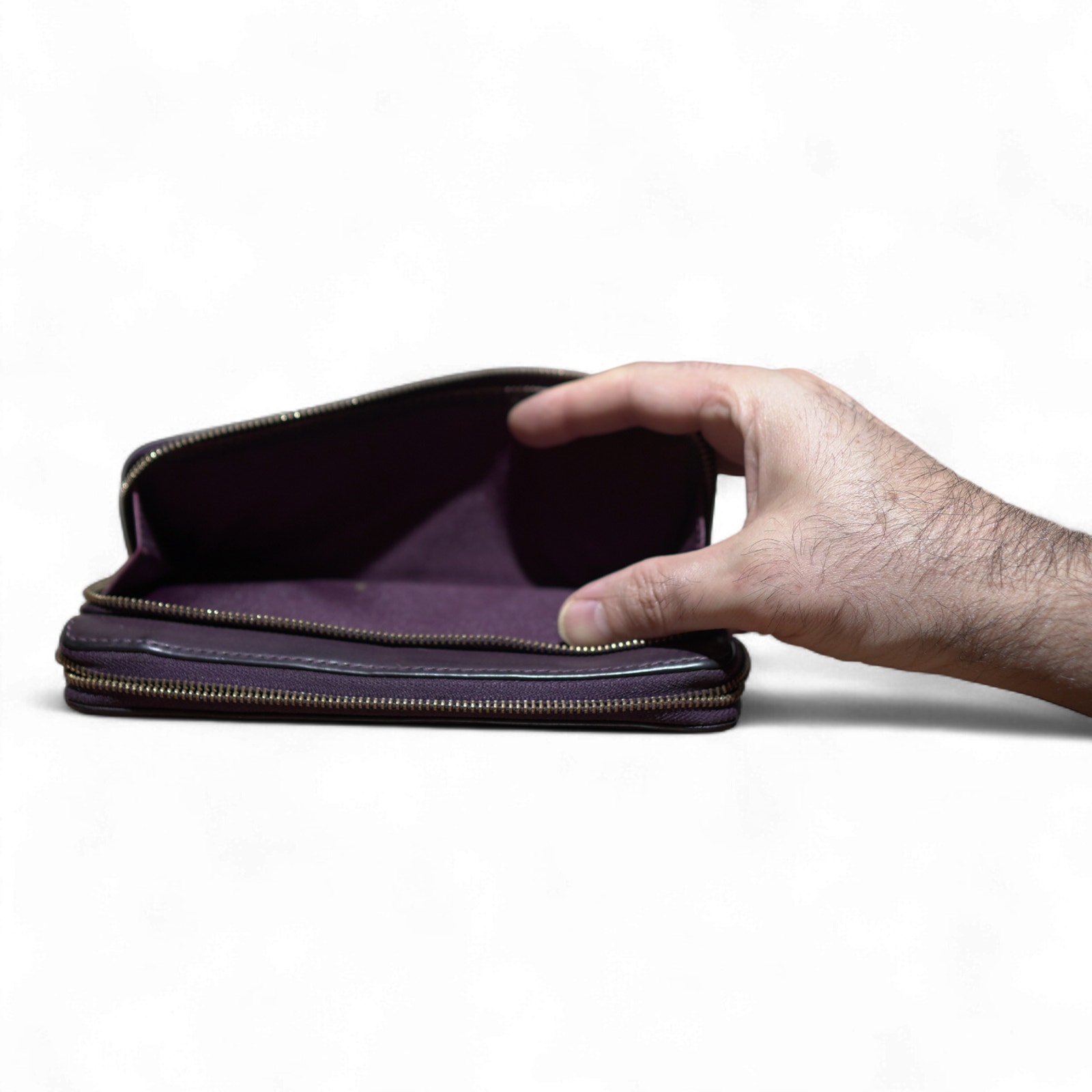 Authentic Coach double zip accordion wallet in rich purple pebble leather. Functional and stylish with ample storage and a unique color tone that complements dark academia and classic looks.