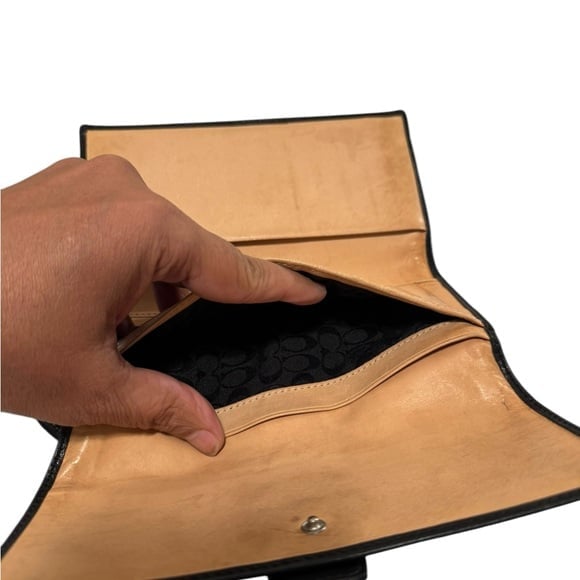 Coach black leather with nickel buckle full size wallet with lots of card holder and an outside zipper for coins. In excellent shape. All leather.