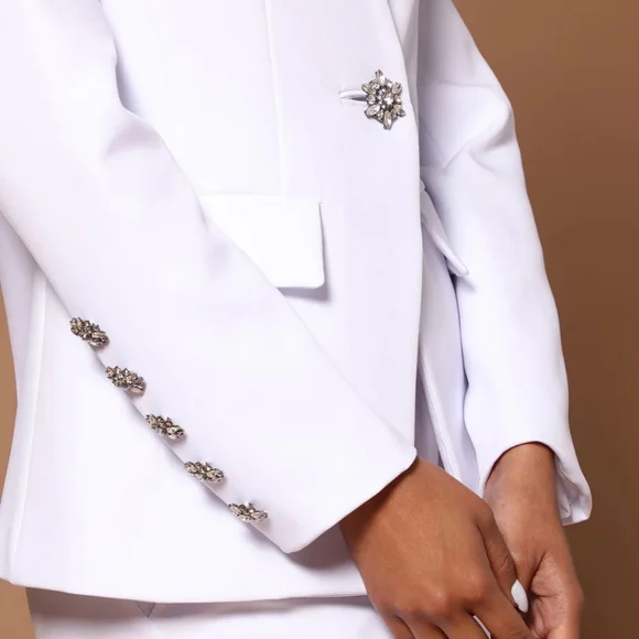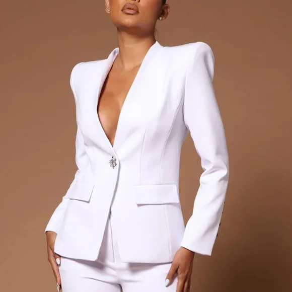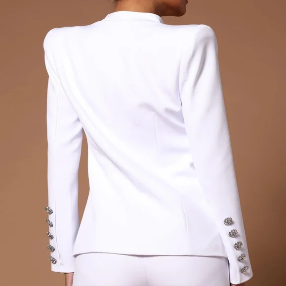 This gorgeous boss blazer and has elegant button detail and made of superb quality. The material is somewhat stretchy as it hugs the body in just the right places. It has pronounced shoulder pads, looks fabulous on, very classy!*Long Sleeve*Shoulder Pads*Deep V-Neck*Embellished Button Closure*Front Pockets*Fully Lined*Semi-Stretch*Self: 95% Polyester 5% SpandexLining: 100% PolyesterBRAND NEW NEVER BEEN WORN!