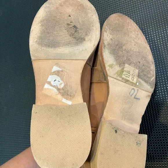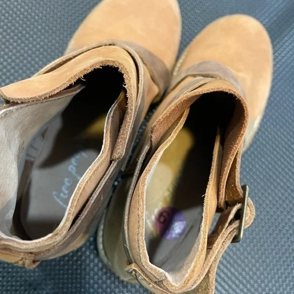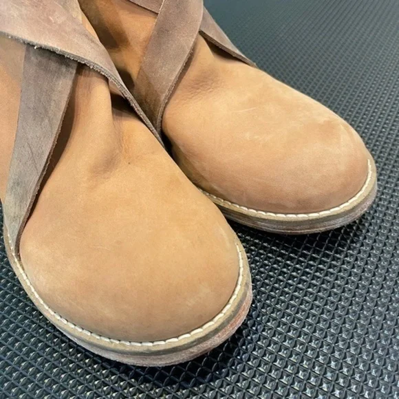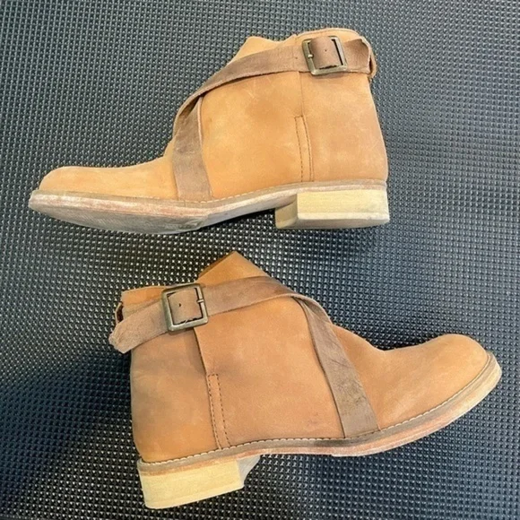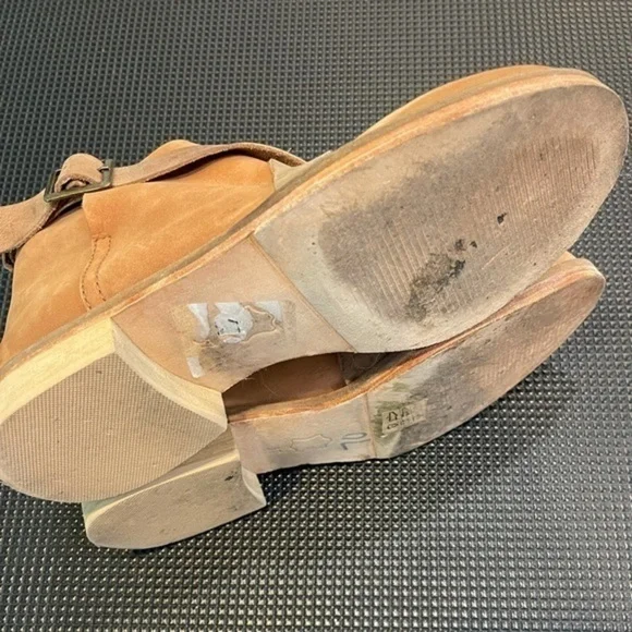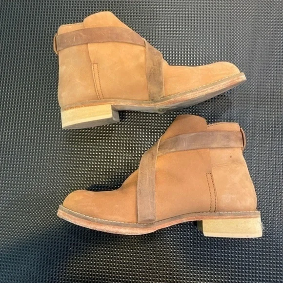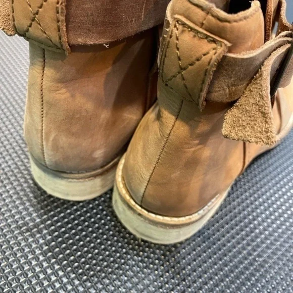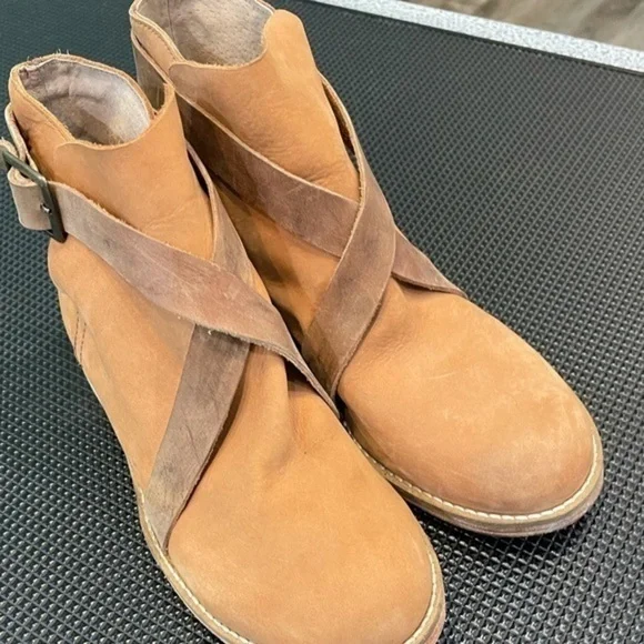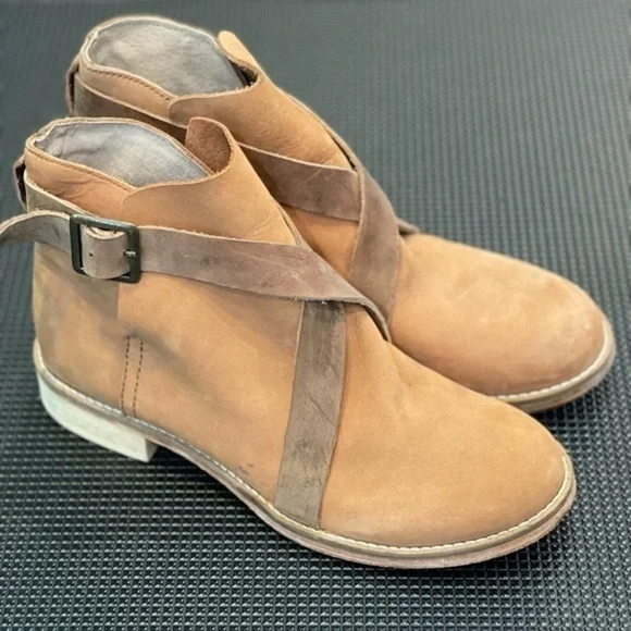 Free People las palmas ankle bootie in Taupe Size: 37 (US Size 7)A lightly distressed sole enhances the authentic, rugged style of a stacked-heel bootie completed with a wraparound buckle strap.1" heel4 1/2" shaftPull-on style with adjustable buckle strapLeather upper, lining and soleImportedGreat Used Condition light scuffs and blemishes. Please see images for more detail.