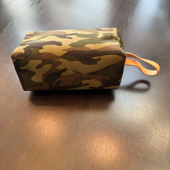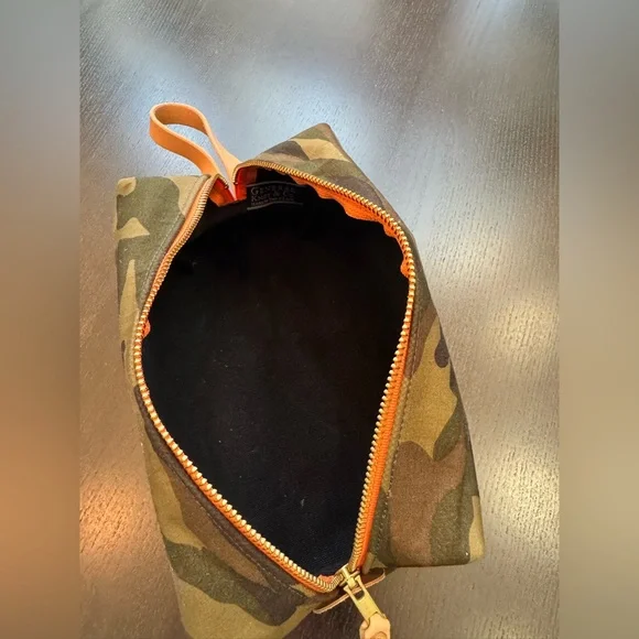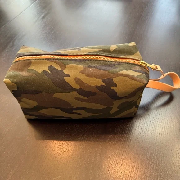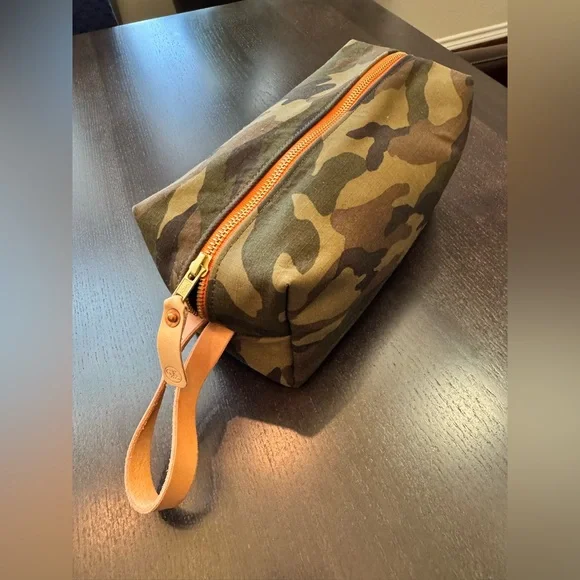 •Color – Camo with natural leather and orange accents•Set out on a new adventure with the Limited Edition Ranger Camouflage Travel Kit. Stay organized and stylish no matter where the road takes you, whether it's the trip of a lifetime or a weekend getaway. The most popular style with textured cotton camouflage pattern printed exclusively in Japan. Taped seams and a water-resistant cotton canvas lining protect your valuables from leaks and spills. Each travel kit is complete with natural brown leather handles and pulls for added style and durability. Travel stylishly, live fearlessly.•Cotton body and leather trim•Limited edition•Brass YKK zipper•Mahogany Brown leather handle that fits perfectly over bathroom doorknobs•Leather tab and zipper pull•Taped seams•10 1/2" Length/ 5" Width/ 5" Height•Made in the USA•Excellent used condition•Smoke-free, pet-free home
