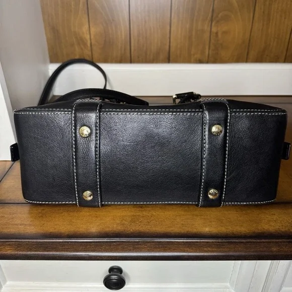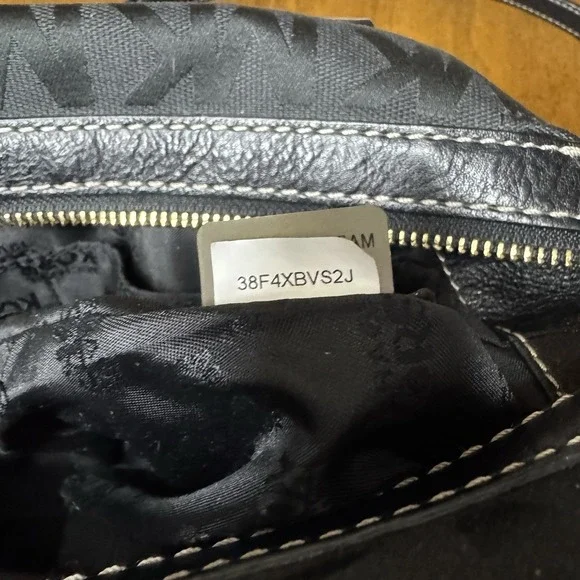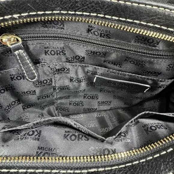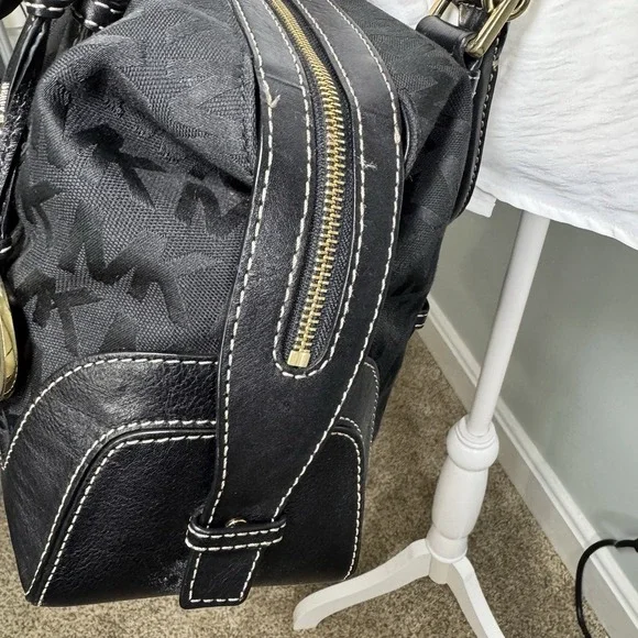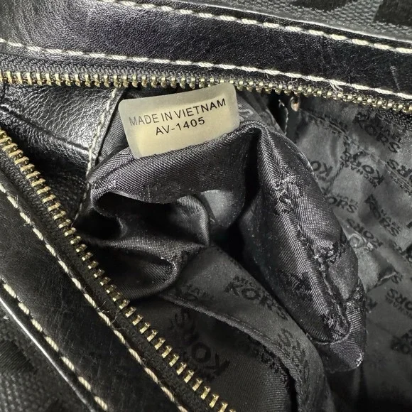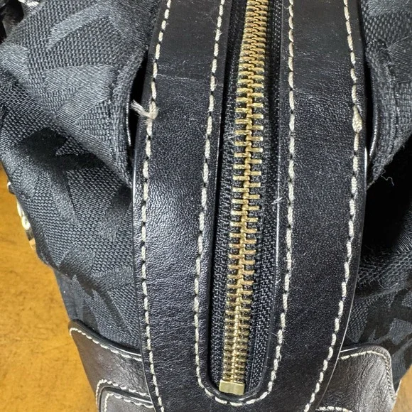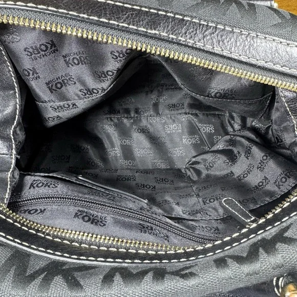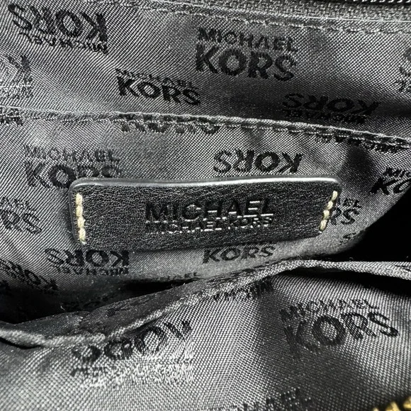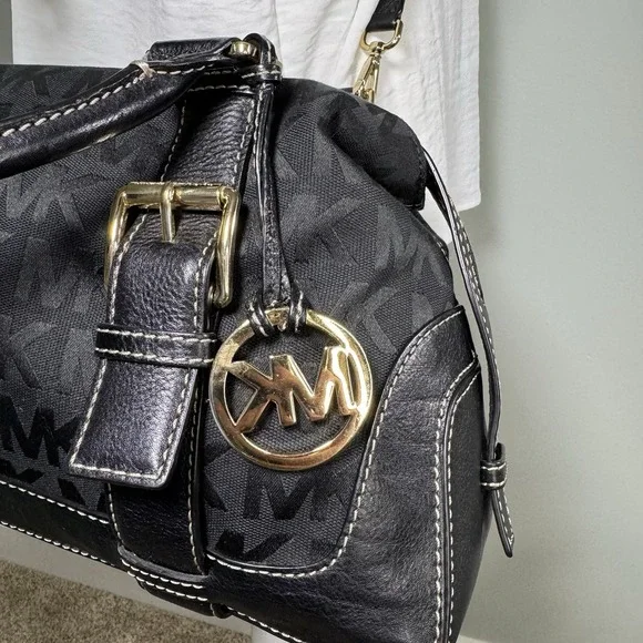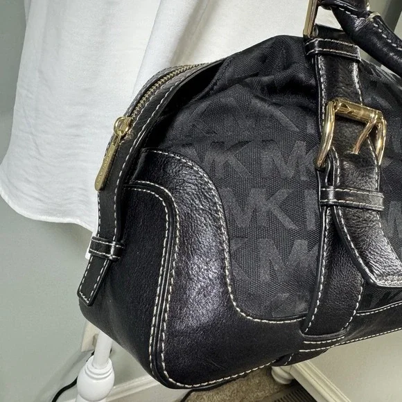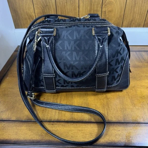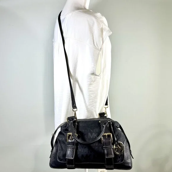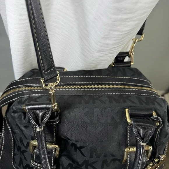 This satchel features a black monogram canvas, leather trim, gold-tone hardware, and a signature MK logo charm. It has a zip closure and multiple interior pockets.Key features of the Michael Kors Brookville Satchel:• Material: Monogrammed canvas with leather trim.• Color: Predominantly black with gold-tone hardware.• Design: Bowling bag shape with buckle details on the straps.• Hardware: Gold-tone accents, including the MK logo charm.• Closure: Top zip closure.• Interior: Multiple pockets, including a zip pocket and slip pockets.Pristine condition inside and out. No tears, marks, or wear found.