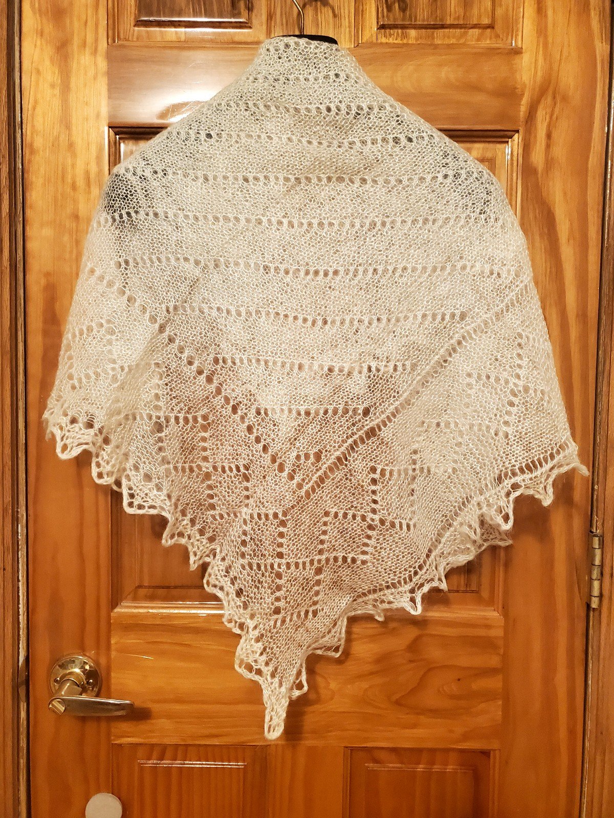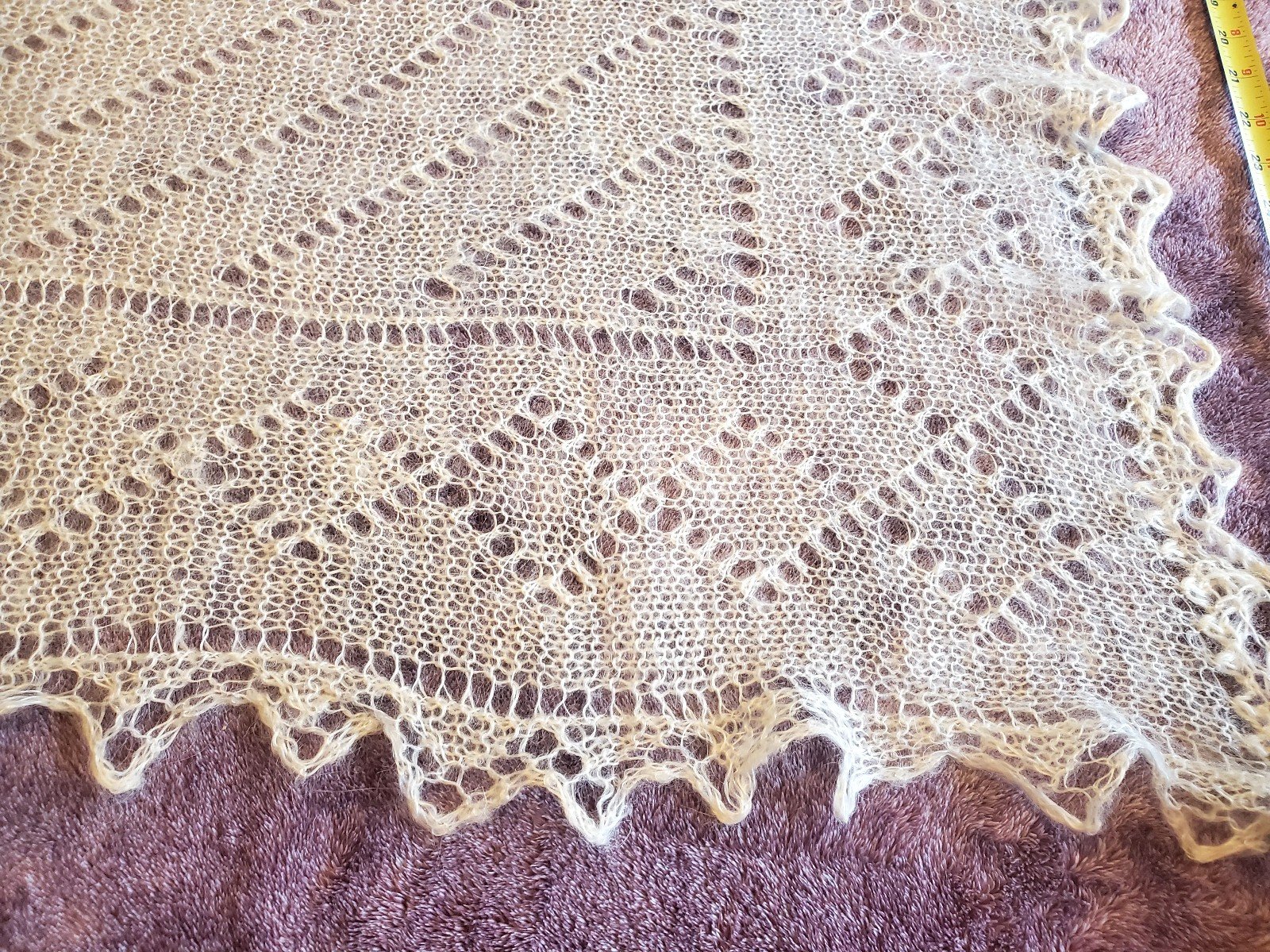 This type of finelyknit, down-hair lace shawl originated in the Orenburg area about 250 years ago, in the 18th century. The Orenburg region of Russia is famous for its shawls, known as Orenburg shawls/scarves/ "Orenburgskyi Platok" in Russian. In the English-speaking world, they are often called "wedding ring shawls" because, although the shawls are quite large, a shawl knit in the traditional fashion is so fine that it can be pulled through a wedding ring (see the last picture).