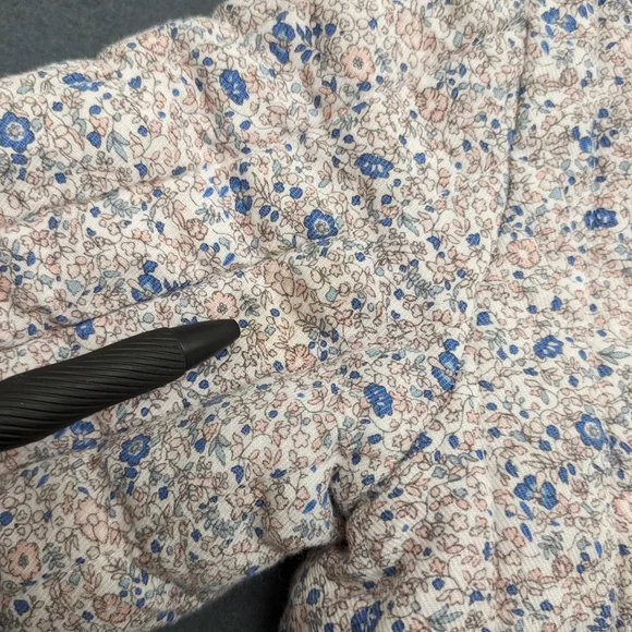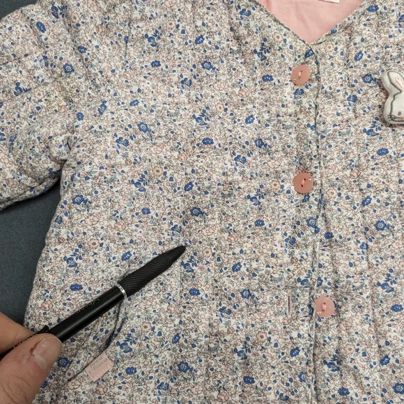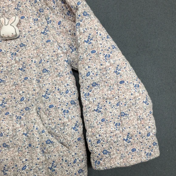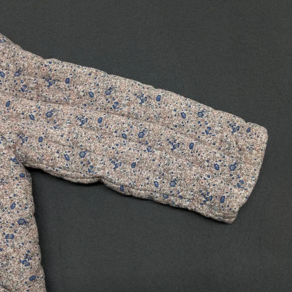 A quilted jacket in soft pink and blue colors, designed for warmth and comfort with a delicate all-over print.Please note: Please see the following measurements in photos.The first measurement is the total length measured from the shoulder to bottom hem.The second measurement photo is the armpit to armpit measurement.All measurements were taking with item laying flat.