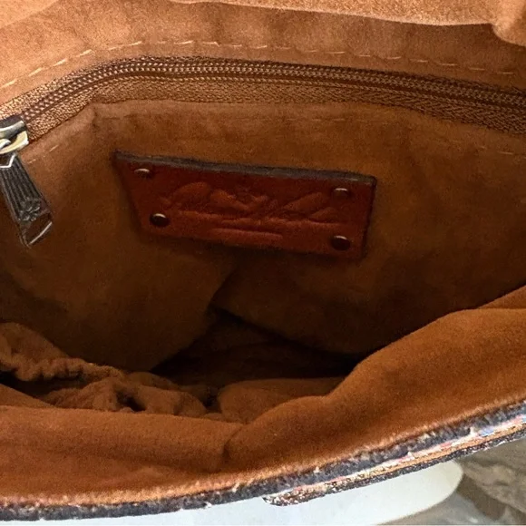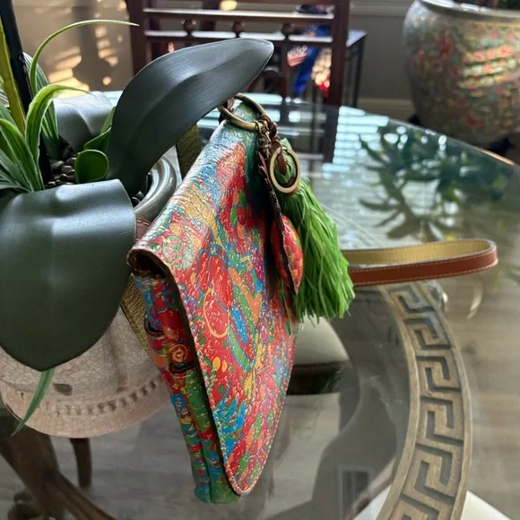 💚🩷PATRICIA NASH TROPICAL SUMMER PINEAPPLE LEATHER MESSENGER/CROSSBODY BAG WITH TWO HANG TAGS! ONE PINEAPPLE HANG TAG AND ONE FRINGE TASSEL! BACK SLIP POCKET WITH MAGNETIC CLOSURE! FLAP OVER STYLE! UNDER FLAP HAS TWO SLIPPOCKET AND ONE ZIP POCKET! INTERIOR HAS A SUEDE LINING WITH ONE ZIP POCKET AND TWO SLIP POCKETS! LONG ADJUSTABLE LEATHER CROSSBODY STRAP! ANTIQUE GOLD HARDWARE! HAS KEY RING ATTACHED TO HANG TAGS! SUPER CUTE! USED ONCE! HAD TONS OF COMPLIMENTS! EXCELLENT CONDITION! 💚🩷