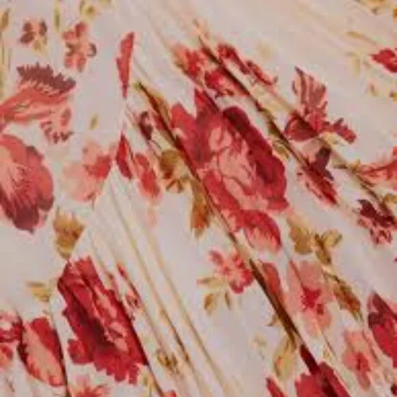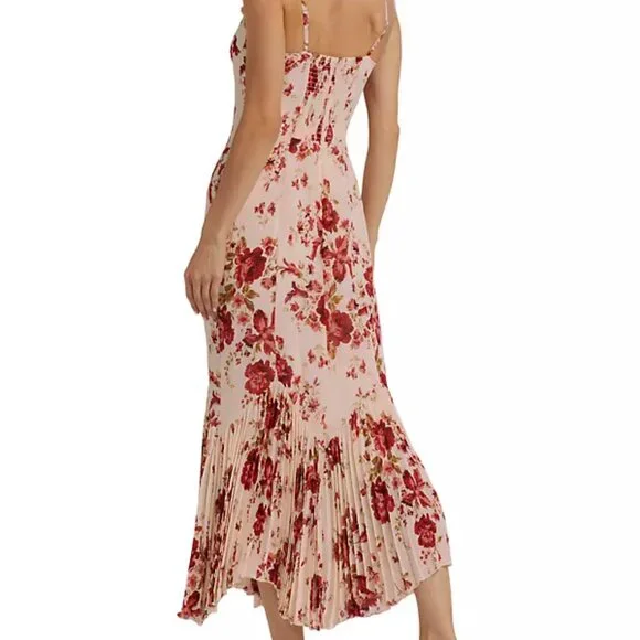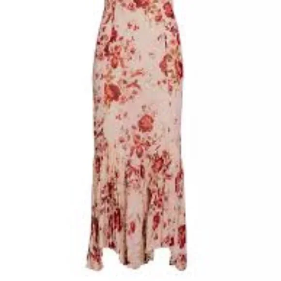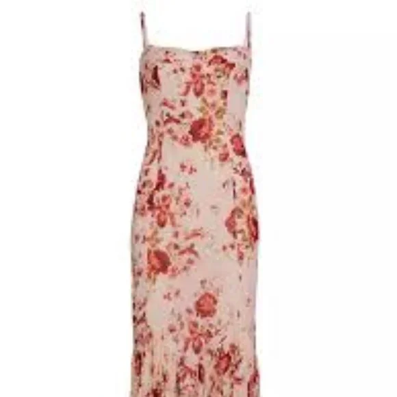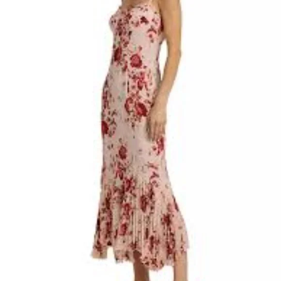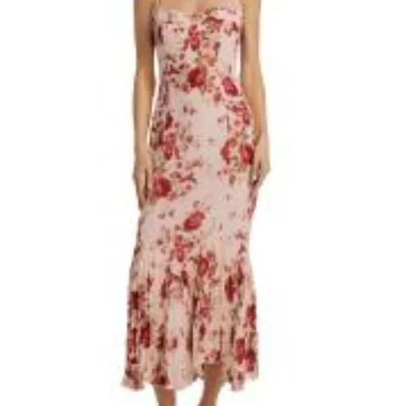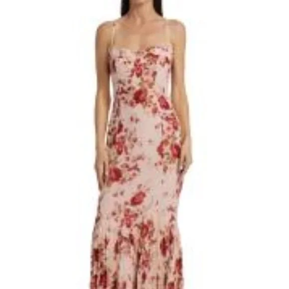 This Aiko maxi dress from Reformation features a vibrant rose print. The georgette piece is designed with a semi-sweetheart neck, adjustable spaghetti straps, and a pleated handkerchief hem.Semi-sweetheart neckAdjustable spaghetti strapsSeamed cups and bodicePleated handkerchief hemConcealed back zip closure100% viscoseDry cleanImported