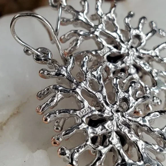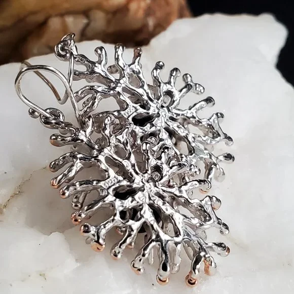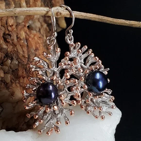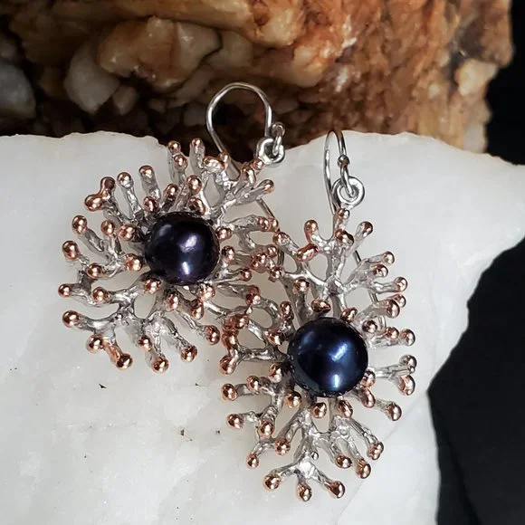 Sterling 925 Silver 14K Gold Unique Designer Earrings Genuine Black Pearls