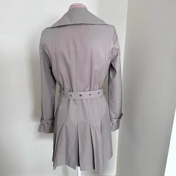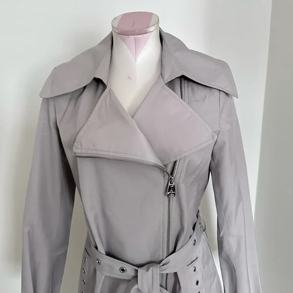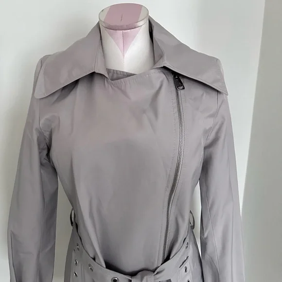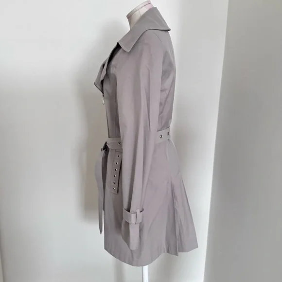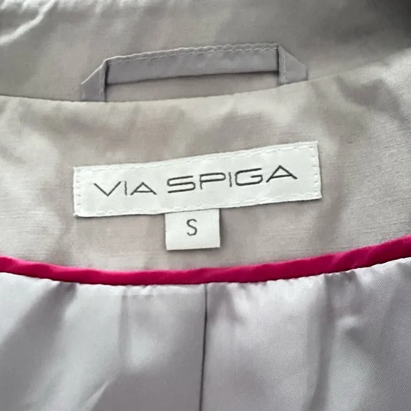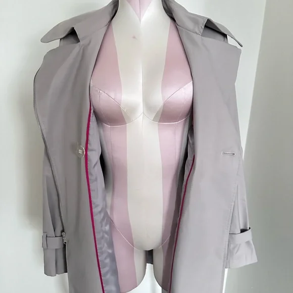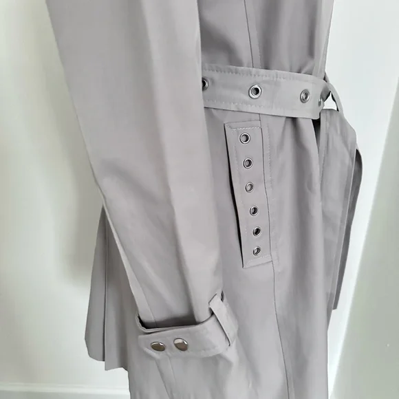 Via Spiga Silver Grey Long Sleeve Trench Coat.Women’s Size S.Absolutely stunning trench coat with big collar, front side zipper, 2 pockets and belt. Beautiful silver grey color. Fully lined.Sleeves decorated with buttoned belts. Measurements: length 33”, waist 34”, sleeves 24.5”, chest 38”.Back has pleated details.Excellent pre-owned condition.Rare to find.