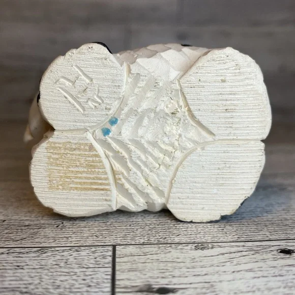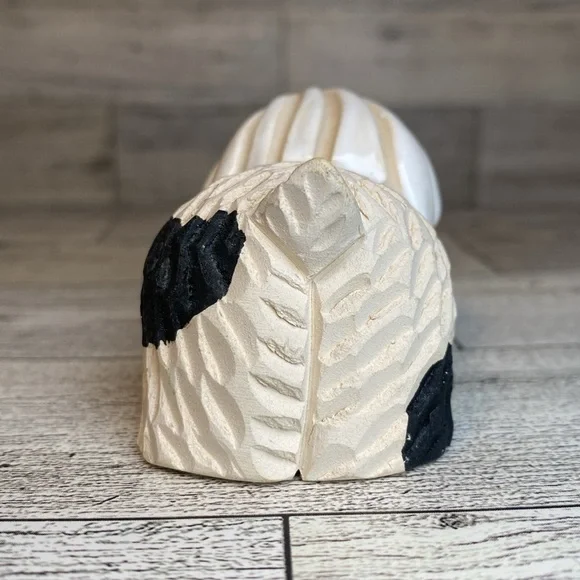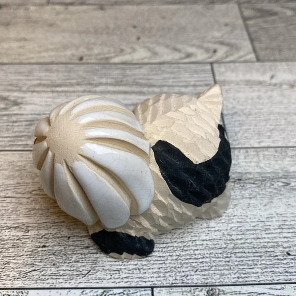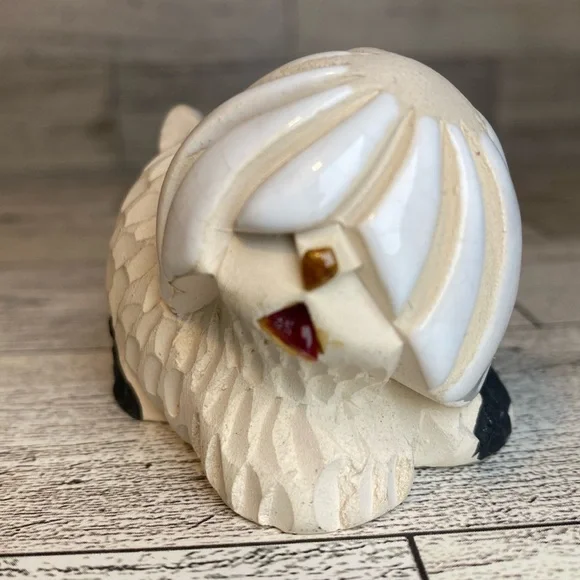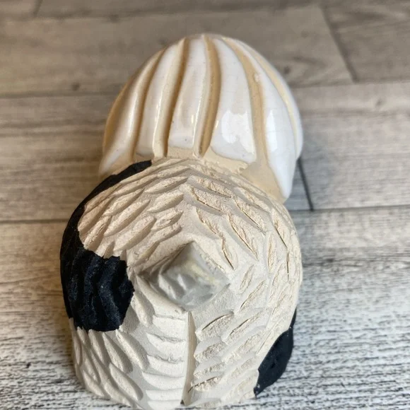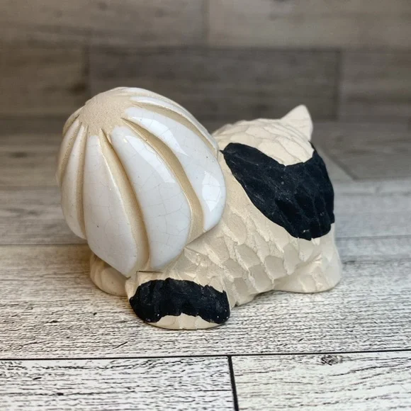 Artesania Rinconada pottery figurine of an Old English Sheepdog. Artesania Rinconada is a company from Uruguay that produces hand-crafted ceramic figurines. These figurines are known for their unique designs, detailed carvings, and the use of vibrant colors and sometimes glass accents.Origin: Hand-made in Uruguay, circa 1980. Material: Ceramic with a glazed finish, possibly with a glass tongue. Design: Captures the shaggy coat and good-natured demeanor of the Old English Sheepdog. Features: Hand-carved hand-painted with unique detailing such as milk glass head of hair brown glass nose and ruby glass tongue, hand painted black spotsCollectibility: It is a vintage and retired piece, making it a collectible item. Artist signed.*Very Good Condition