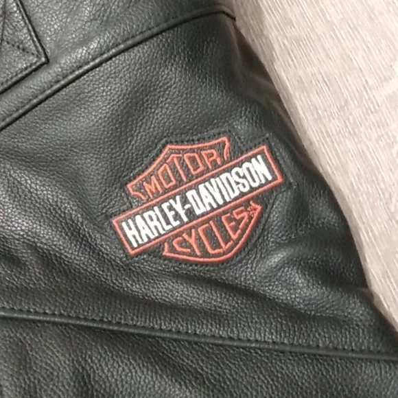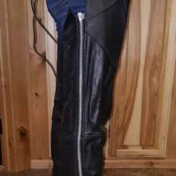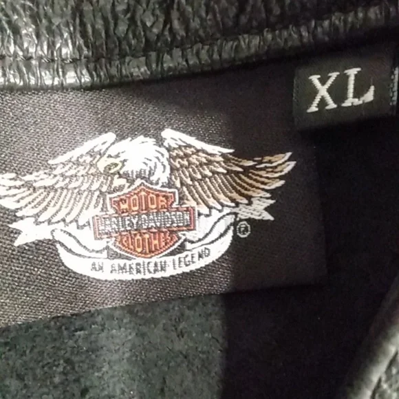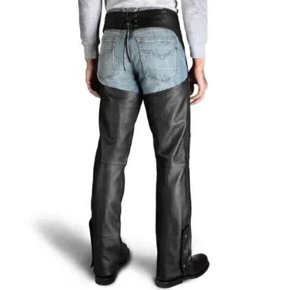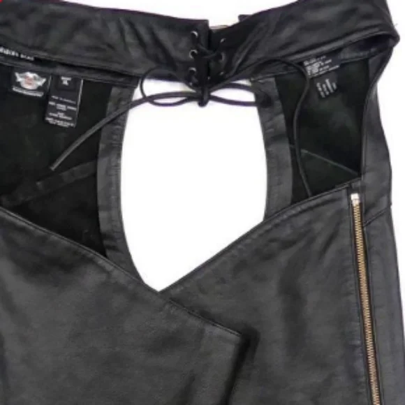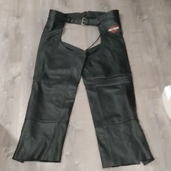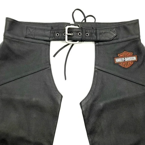Authentic Harley Davidsonvintage Size XL MensColor: BlackFit & mobility: Midnight cowhide leather. Buckle closure with adjustable back laving. Cuttable hem. Ride enhancing features: Zipper leg with snap pocket.Men's motorcycle chaps features simple styling to match any leather vest or jacket. Buckle closure & adjustable laving provide custom fit. Gently worn. Leather is clean & conditioned. Great vintage condition.