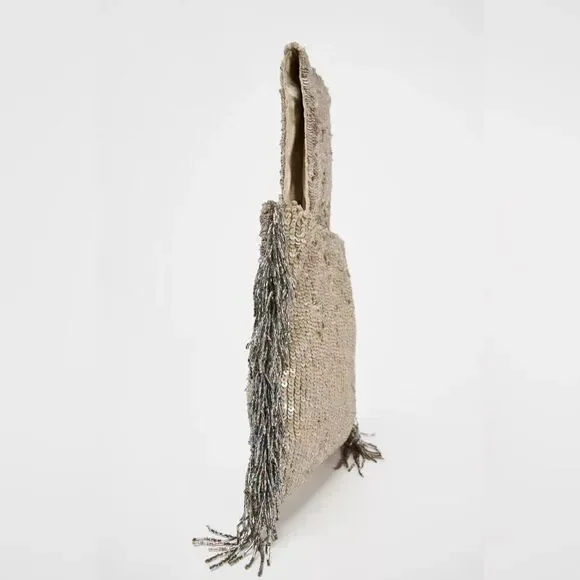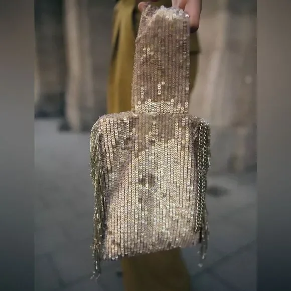 ZARA FRINGED SEQUIN MINI BUCKET BAGCOLOR BEIGEMini bucket bag with sequin detail exterior and handle. Removable chain crossbody strap. Side fringe and sequin details. Lining and interior pocket. Magnetic closure.Height x Length x Width: 4.3 x 6.7 x 0.6 inches (11 x 17 x 1.5 cm)MATERIALSCOMPOSITIONOUTER SHELLMAIN MATERIAL100% polyesterSHOULDER STRAP100% ironLINING100% polyesterBIN B9
